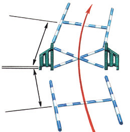 在拐弯处,摆一个交叉杆,在交叉杆的前后各放一个地杆,这样的练习可以改进马匹以正确的腿着地。(如下图)