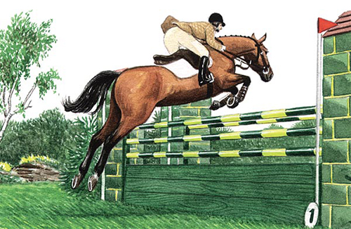 骑手和马匹都需要做很多跳障碍练习。先从地杆练习,到体操练习,然后用不同步法跳不同种类的障碍,以及变换角度跳和各种回转,这些内容都应有计划地练习。试着平时多跳一些小全程,不要只跳一道障碍或跳完一道障碍后马匹就变成凌乱的快步或不协调的跑步。每做完一个练习,都要有很好地向下变换,而且不要让马匹来决定下一步去哪里。有机会的话,多看看专业人员训练。