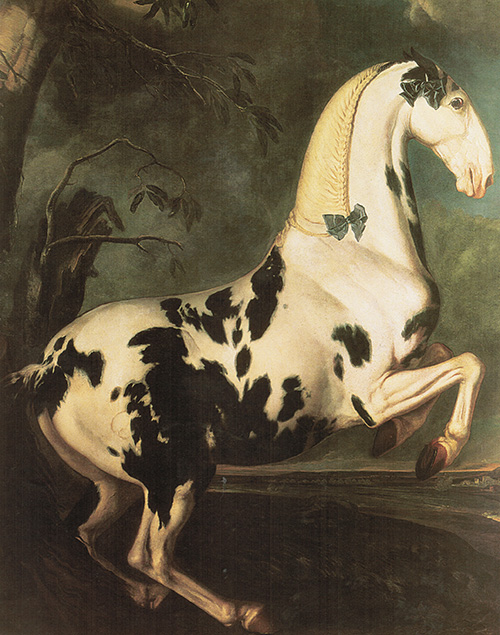 画面中的这匹花斑马是一匹来自列支敦士登的伊斯格鲁布种马场的种公马。该种马场是由卡尔·尤西比乌斯王子(1611年至1684年)所创立。他的马房目前拥有120匹不同品种的种马,在欧洲享有盛誉。起源于西班牙的马,不管是生理还是心理,都是最符合古典马术严格要求的马种。尽管如今的人们在提到这种艺术形式时,大多想到的是传统的白色利比扎马。但在十八世纪,很多西班牙马都是单色或者带有斑点的毛色,并且在当时很是时髦。(马术杂志)