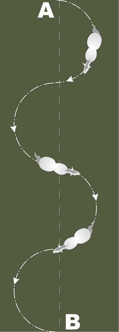 在日常训练中,马匹在进行不同步伐之间的变化时,太容易出现动作失误了。在这种情况下,你可以使其前肢受力、向外拉,但终究无法解决最基本的问题。为了让马匹对你的辅助反应更为准确,更加顺畅,可以试试下面这个练习。在A点,首先做一个右侧的慢步到跑步的变换,接着做一个10米的半圈乘,然后再到达中心线时变换到慢步,再进行另外一个10米半圈乘时,让马匹开始左跑步。当再次接近中心线时,变换到慢步,然后即刻开始右跑步。重复几次之后,你便很快发现你的马匹更能“听懂”你的辅助了。这个练习的要点是要让马匹“快乐地跳跃”到跑步,而骑手本人不需要特别做什么,而是随着马匹,由它带着你去完成这个动作。