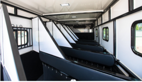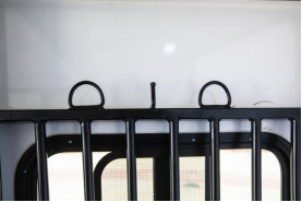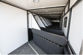 箱体内,凡是马匹接触面均有软包设计,贴心呵护马匹安全。在每个马头上部加装绳索和马料固定点,前板处增加小门方便进出。