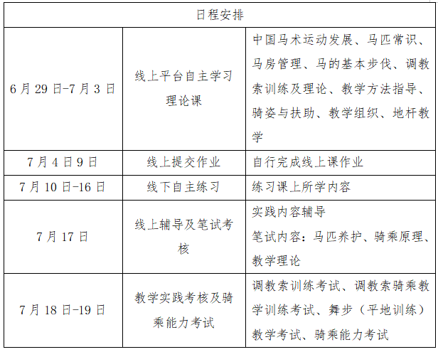 马术一星级专业教练培训考核将于2023年6月29日-7月19日在线上开班。本次活动以线上方式进行培训与考核,中外专家联合授课。考核合格者将被授予中国马术一星级专业教练员能力水平证书,并可进一步申报全国初级教练员岗位班,经考试合格后获取初级职称。