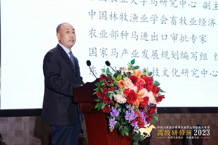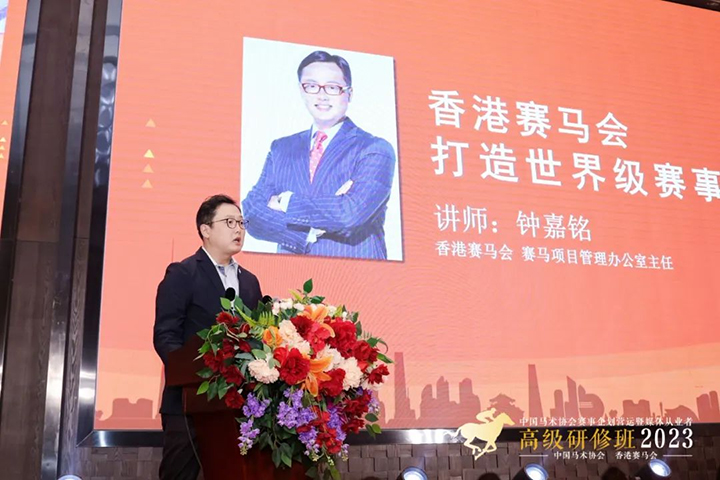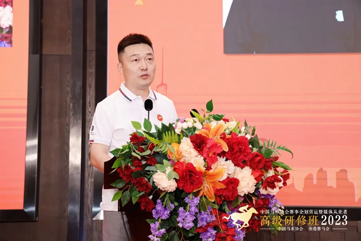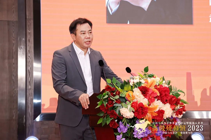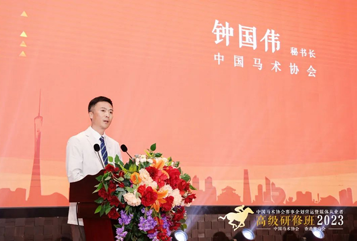 中国马术协会秘书长钟国伟在致辞中表示,中国马术协会将习近平新时代中国特色社会主义思想主题教育和工作实践相结合,致力推动行业高质量发展,以实际行动坚定拥护“两个确立”坚决做到“两个维护”。我们本着为国争光、建设体育强国的初心使命,以服务行业、助推行业发展为目标,贯彻落实全国马产业发展规划的要求,动员了国际组织专家学者等多方力量,主办了这场面向从业人士、媒体人员的公益性的培训活动,旨在夯实国内马产业人才队伍建设根基,吸纳多领域的优秀人才,共同助推中国内地速度赛马及马术运动产业的高质量发展。新一届中国马术协会在国家体育总局的正确指导下,全国马术同仁的支持下,张小宁主席带领下,五大体系建设齐头并进,在奥运竞技、群众体育、青少年体育等方面取得进展。15天前,中国马术三项赛队在爱尔兰虎口拔牙,力克曾获世锦赛第四名的强劲对手日本队,再度斩获巴黎奥运团体及个人参赛资格,新的奥运备战周期开启,催生中国马术发展新动能,在这样的背景下,中国马术协会与香港赛马会开展了新一轮的全面推进国家赛马马术产业的战略合作。我们在香港赛马会的大力支持下,以研修班为平台,集聚马术智慧、媒体力量,打造链接推动全国马产业快速、高质量发展的新格局。