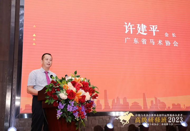 广东省马术协会会长许建平在随后的致辞中表示,中国马术队接连在东京奥运会等重要赛事中取得了历史性突破,激励了更多的人群参与到马术运动中,马术运动就如春天一般,处处充满生机,其中广东省现就有近50家马术俱乐部,参与马术活动的人群约近50万人,全年开设了近20站的比赛,并首次列入了去年举办的省运会,有效地推动了省马术运动和马文化马产业的深入开展。由中国马术协会主办的这次研修班正式开班,通过权威、专业的宣讲学习,能进一步弘扬马术运动的正能量,进一步规范马术运动健康发展,能更好地促进对马术运动的报道宣传,让更多的人了解和参与马术运动,也将更好地配合《粤港澳大湾区发展规划纲要》指出的推进粤港澳大湾区地区马匹运动及相关产业发展的要求。