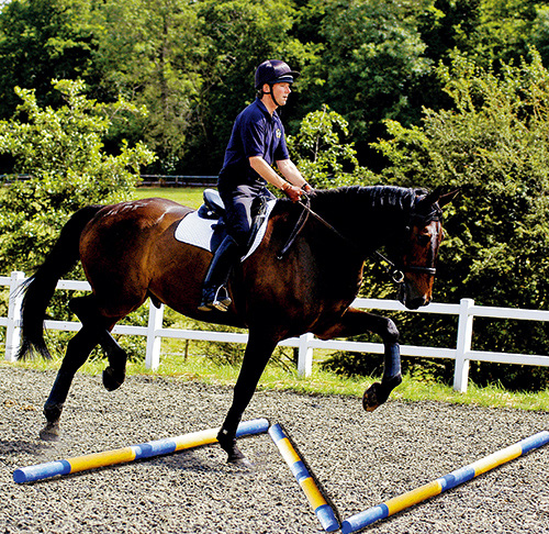 将地杆摆放成“Z”字形,这会引起马的注意,这项练习是测试骑手能否通过腿和手的辅助让马保持正直。先走慢步,再用快步,但都要保证马在接近和离开地杆的时候始终保持正直,在平地如此,跨越地杆时也应如此。