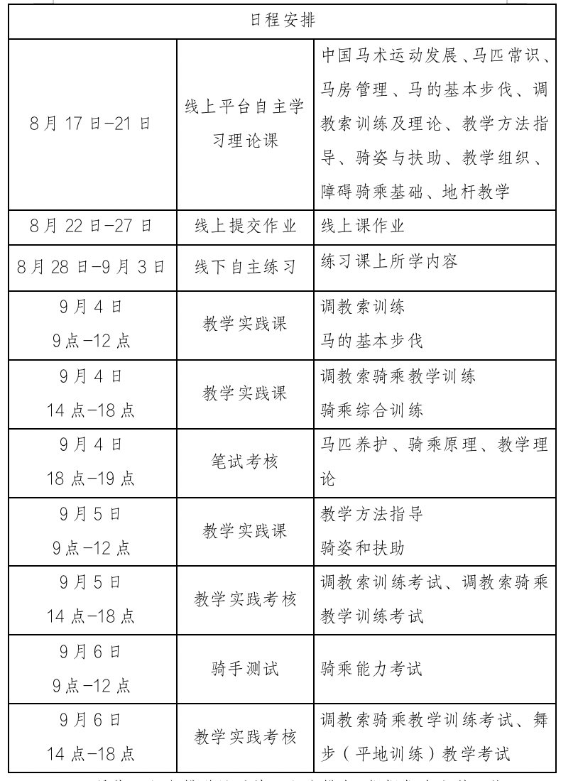 (三)线下辅导和实践考核:2023年9月4日-6日,在安徽震龙马术俱乐部进行线下集中辅导与实践考核。
