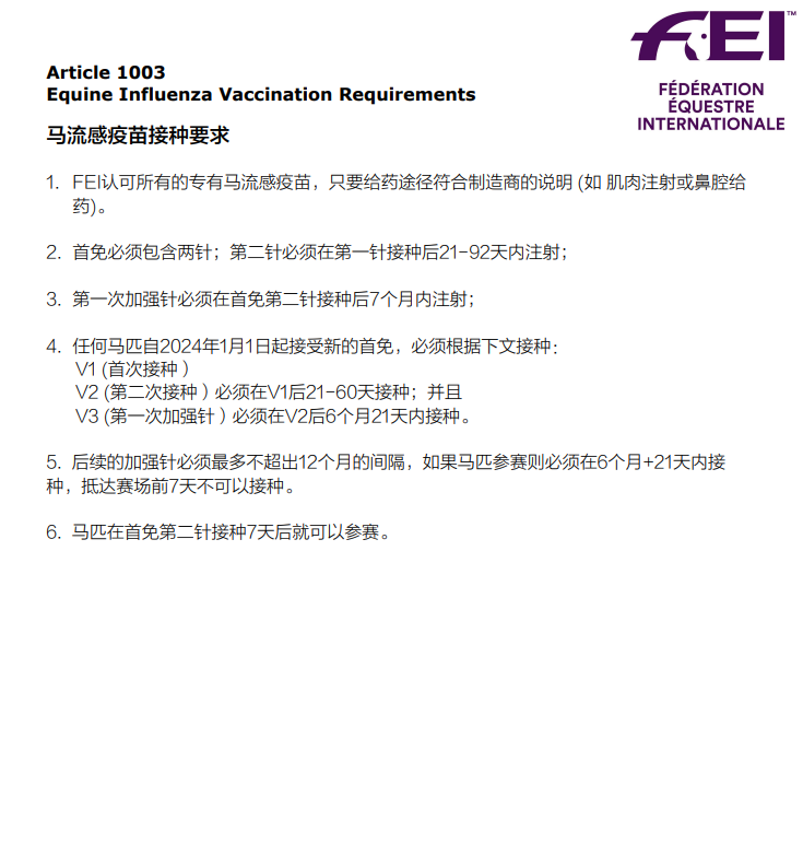 (二)各参赛运动队及马匹请于2023年7月20日前报到。报到时请同时提交马匹护照和马匹检疫证明,未提交相关证明的马匹不得进入马厩。参赛马匹均须按国际马联相关规定注射流感疫苗,并在护照进行详细记录,无疫苗或疫苗不符合国际马联要求的马匹,组委会有权拒绝其参赛。