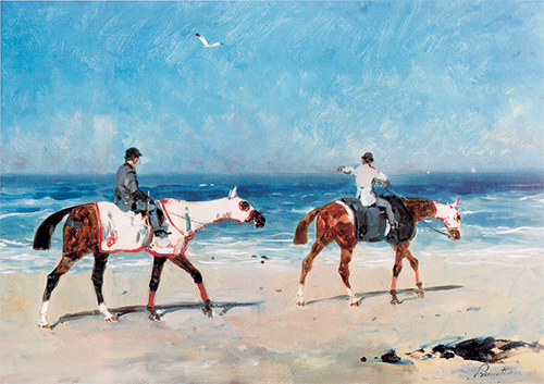 这幅画为我们展现的是两个年轻人骑着赛马在海边练习比赛的场景,从画作的色彩及构图不难看出,布兰斯托对色彩的把握精准到位,且表现技法自由、流畅。《在海边漫步的赛马》画作的诞生有其独特的历史背景:19世纪中期,赛马是欧洲的第一运动,法国的赛马风潮也一度在国内盛行,法国的艺术家们更是从不同的角度充分发挥灵感和想象力,各种以赛马为主题的优秀作品不断问世。