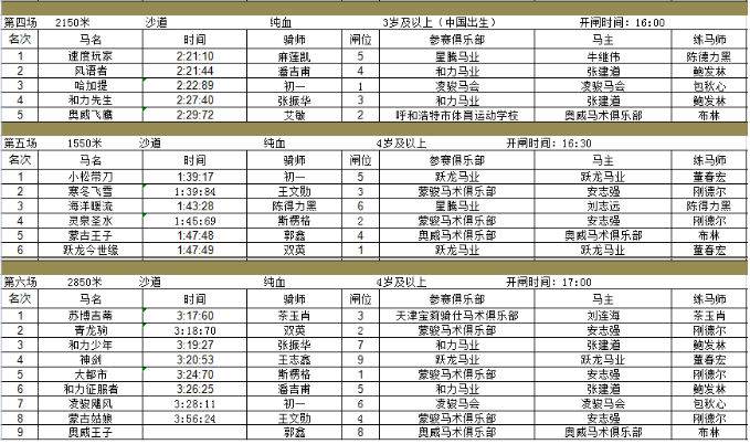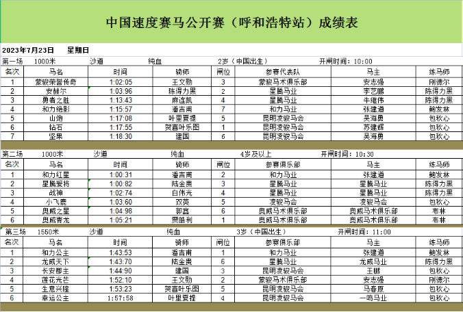 2023年7月23日,由中国马术协会主办的2023年中国速度赛马公开赛(呼和浩特站),在呼和浩特市奥威马文化运动休闲小镇赛马场开闸,各参赛马匹成绩如下: