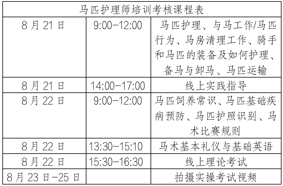 根据马术专业人才培养计划,我协会将于2023年8月21日-22日在线上举办马匹护理师培训考核活动,合格者授予中国马术协会相应等级马匹护理师证。现就本次培训考核相关事宜通知如下: