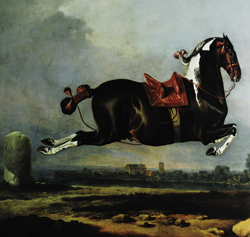 这幅作品充满了不同寻常的自相矛盾之处,一匹健壮的花斑牡马,正自觉地表演马术训练中的Levade(马术表演中的一种动作,马前肢扬起,身体成45度角向前倾斜,然后腾空后蹄),Levade是“马术跳跃练习”(简单来说就是一系列控制下的跳跃动作)中最初级的动作,是其它复杂的马术训练课程的基础。也就是说,画家描绘了一匹骏马,它未受人约束,但却完成了一个原本需要指令的古典马术动作。