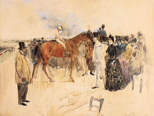 这幅《多维尔赛马》以法国著名的赛马场为创作背景,透过熙熙攘攘的人群,我们会不由得联想到法国兴盛的马业,观看赛马甚至成为法国上流社会的达官显贵互通有无的一个重要契机。画中还为我们呈现了容色妍丽的女士们,身着为赛事精心定制的礼帽及时装同男宾一同出席赛马活动,这种引领法国时尚潮流的穿戴恰恰证明了法国人与生俱来的浪漫情致和对赛马文化的热爱。(马术杂志)