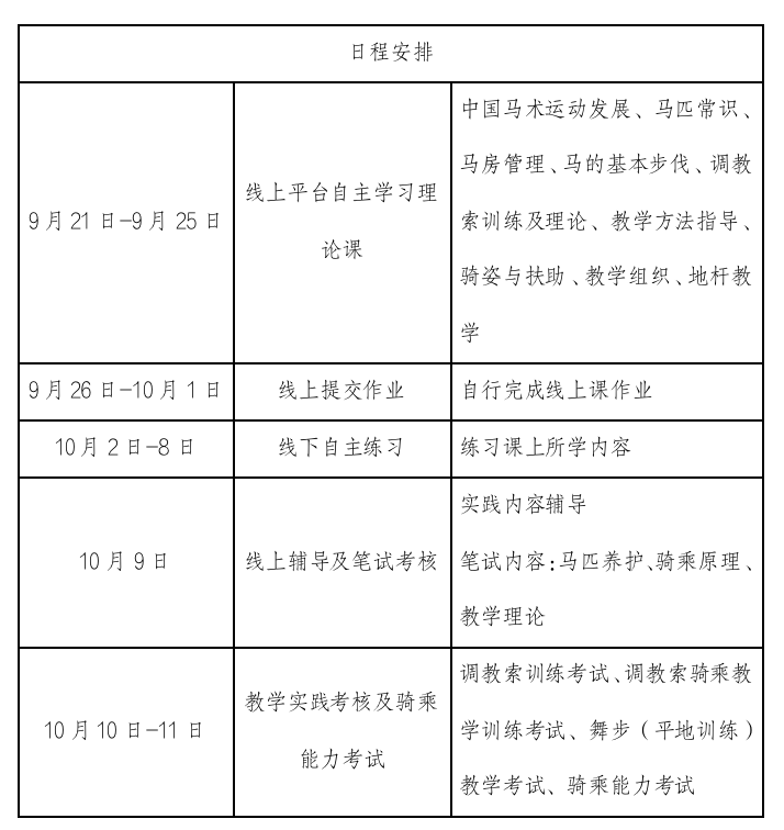 马术一星级专业教练培训考核将于2023年9月21日-10月11日开班。本次活动以线上、线下相结合方式进行培训与考核,中外专家联合授课。考核合格者将被授予中国马术一星级专业教练员能力水平证书,并可进一步申报全国初级教练员岗位班,经考试合格后获取初级职称。