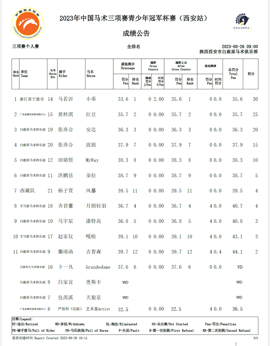 2023年中国马术三项赛青少年冠军杯赛(西安站)于2023年8月24日(周四)至26日(周六)在陕西西安市白鹿原马术俱乐部举办。此次比赛共有20名骑手参加,其中不乏参加第一届学生(青年)运动会的优秀青少年选手。