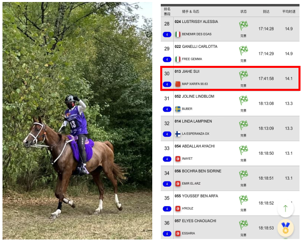 本次耐力赛程共120公里,隋佳禾在比赛第二程因雨天路滑而滑倒,但是很快调整状态再次上马,骑行历时11个小时,坚持完成了比赛。 而她本人表示,期待在下次世青赛展现出更好的状态和成绩。 隋佳禾之前以197分的总成绩在国际马联耐力赛青少年骑手世界排名中位列第七,经过国际大赛的历练,这位中国最年轻的世青赛骑手未来可期。