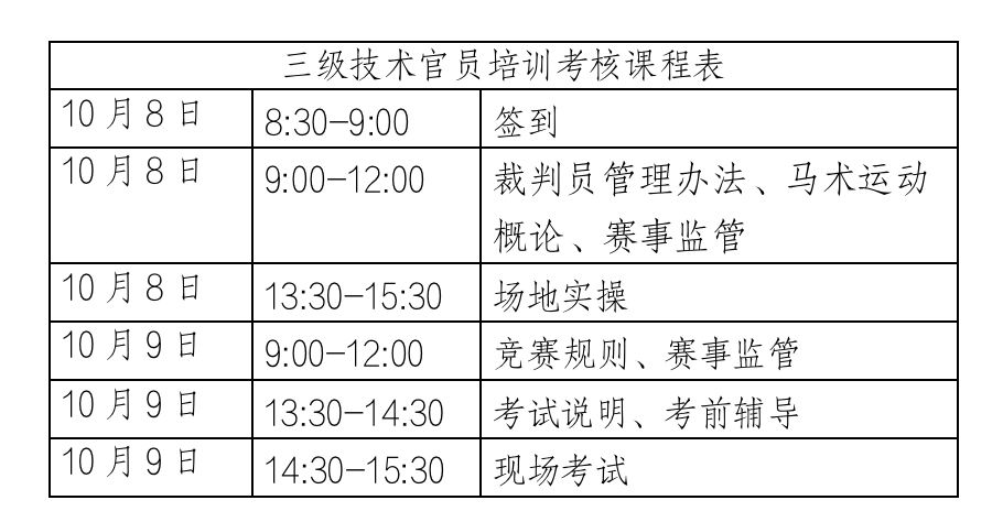 根据马术专业人才培养计划,我协会将与浙江省马术运动协会于2023年10月8日-9日在天驿兴嘉马术俱乐部举办马术场地障碍三级技术官员培训考核活动,合格者授予中国马术协会相应等级技术官员证。现就本次培训考核相关事宜通知如下: