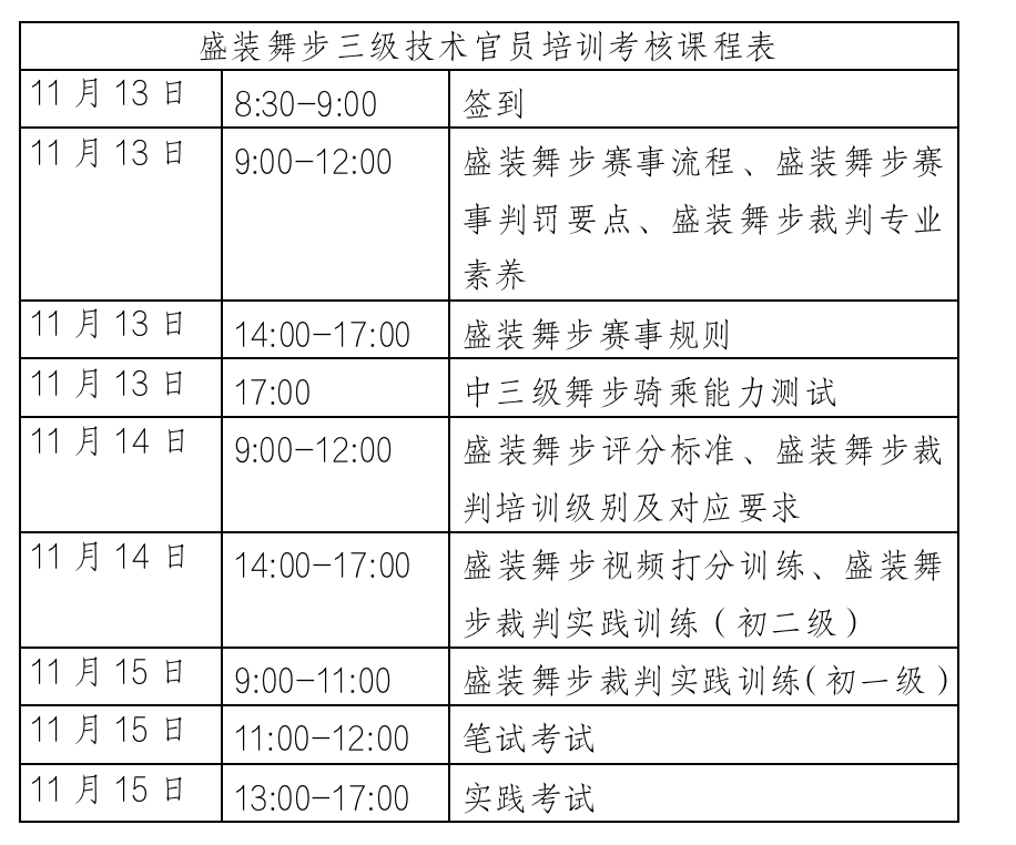 2. 盛装舞步三级技术官员培训考核收取报名费:1650元,如有学员因盛装舞步中三级测试未通过无法参加后续实践考核将退还考核费800元,租马费不退。