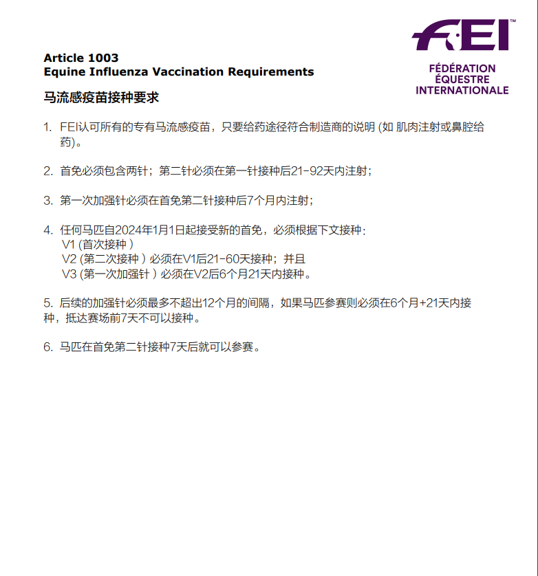 各参赛运动队于2023年11月16日报到,报道的同时提交马匹护照和马匹检疫证明,未提交相关证明的马匹不得进入马厩。参赛马匹均须按国际马联相关规定注射流感疫苗,并在护照进行详细记录,无疫苗或疫苗不符合国际马联要求的马匹,组委会有权拒绝其参赛。