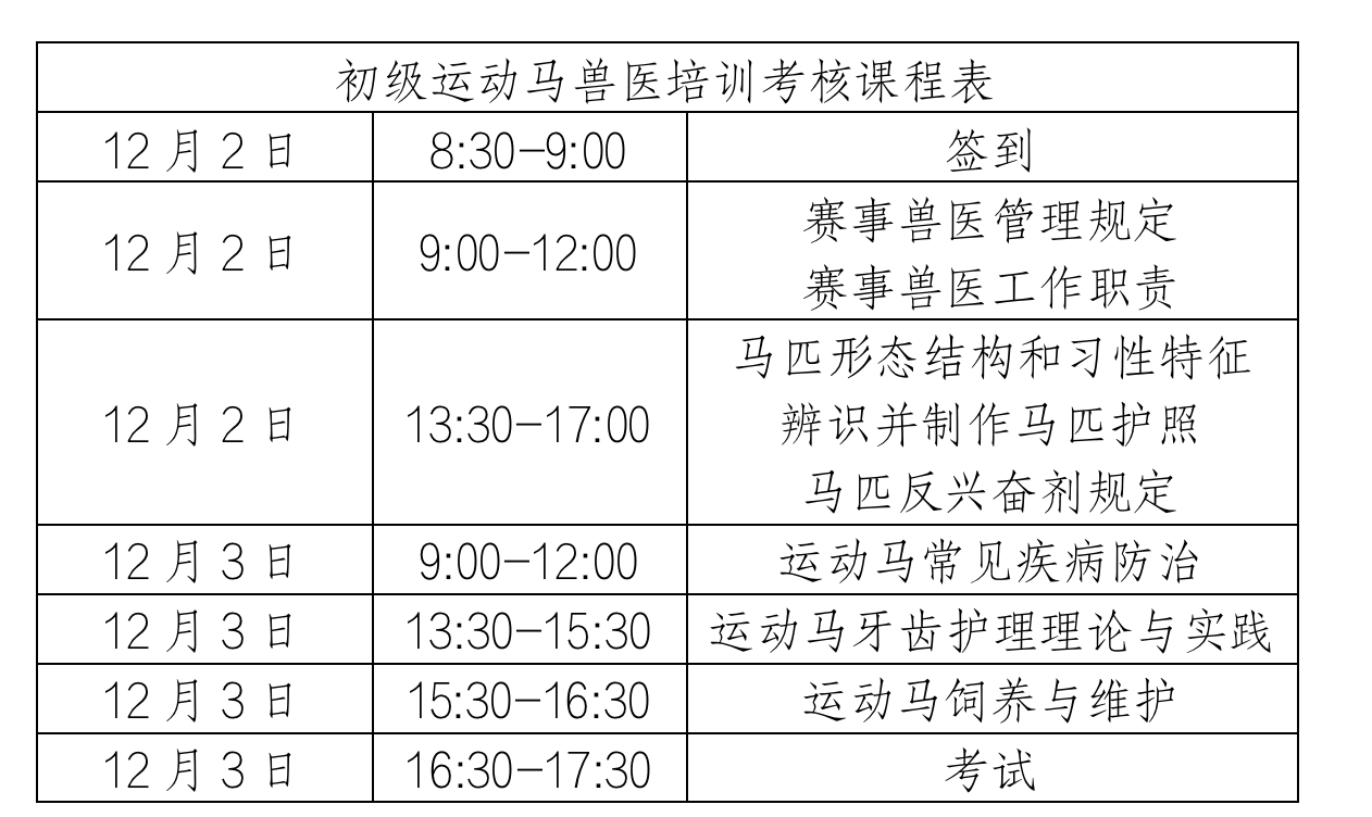 根据马术专业人才培养计划,我协会将于2023年12月2日-3日在武汉商学院举办运动马兽医培训考核活动,合格者授予中国马术协会相应等级证书。现就本次培训考核相关事宜通知如下: