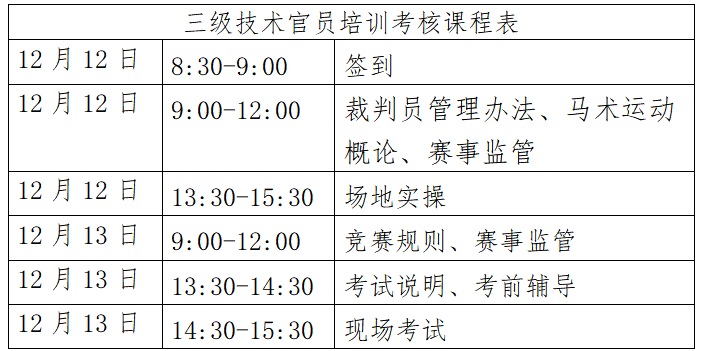 根据马术专业人才培养计划,我协会将与南昌市体育局于2023年12月12日-13日在江西南昌一朵青云马术运动中心举办马术场地障碍三级技术官员培训考核活动,合格者授予中国马术协会相应等级技术官员证。现就本次培训考核相关事宜通知如下: