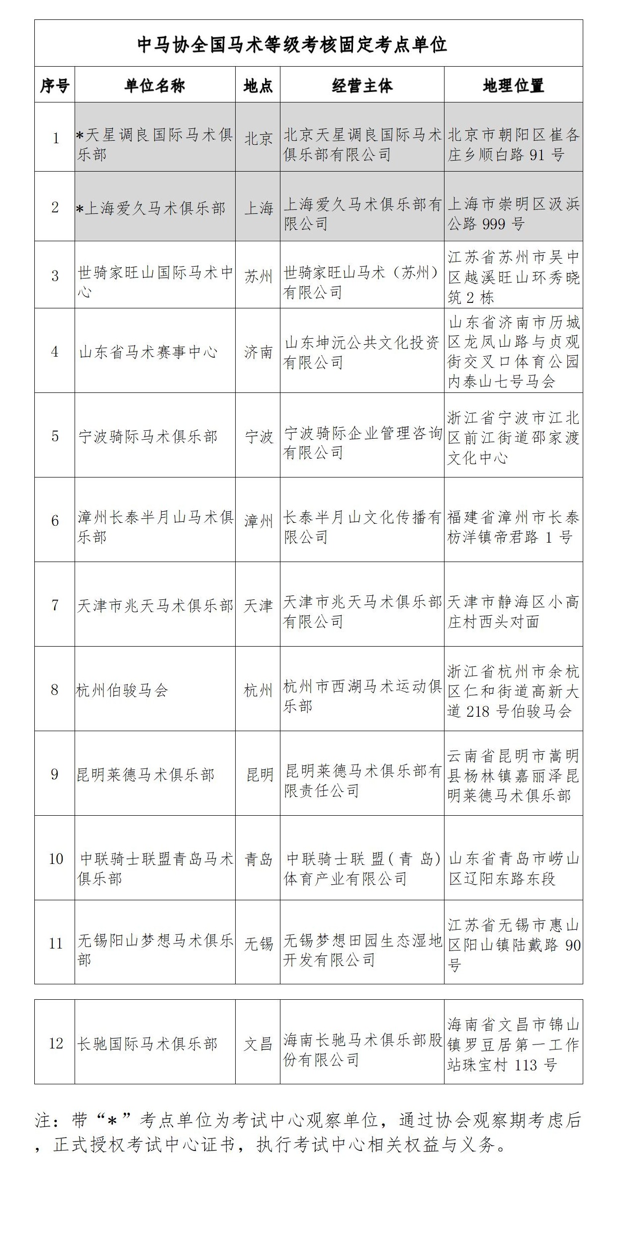 我协会于前期发布了《中马协关于招选全国马术等级考核固定考点的通知》,截止日期前,共收到20余家申请单位提交的申请材料。我协会针对所有申请单位进行了材料核查、实地考察以及综合评估,经研究确定了首批全国马术等级考核固定考点单位。现就首批全国马术等级考核固定考点单位名单公布如下: