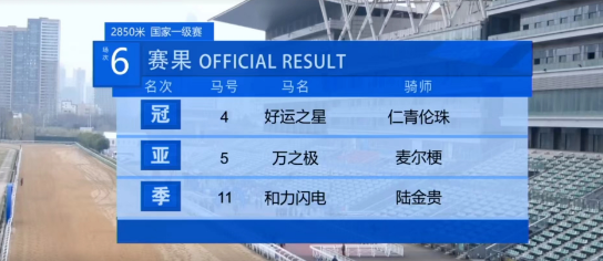第六场“同进杯”4岁中国出生纯血马2850米赛事,最终来自马主闫立新名下“好运之星”赢得末战;六场赛事精彩纷呈,让现场观众激动欢呼!