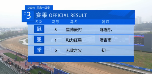 第三场“江城杯”4岁及以上1000米赛事,汇集成年马短途好手,最终来自星腾马业名下“星腾爱将”赢下此战。