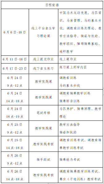 (三)线下辅导和实践考核:2024年6月24日-26日,在南宁市凯比泰马术俱乐部进行线下集中辅导与实践考核。