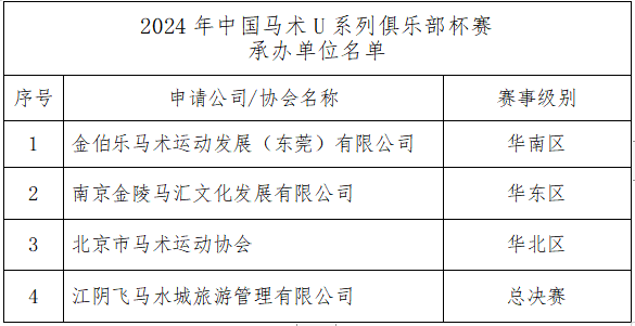 根据《中马协关于公开招选2024年中国马术系列赛事及活动承办单位的通知》内容,我协会于近期组织并完成了2024年中国马术U系列俱乐部杯赛招选工作。根据评选结果,以下单位为赛事承办单位: