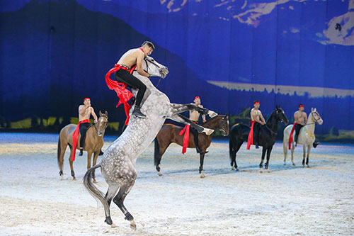 首先出场的是来自新疆野马集团的汗血马团队和来自内蒙古马术队的表演团队。新疆骑手们展示了哈萨克族特色的无鞍骑乘,内蒙的草原汉子们则娴熟地展示跃马、转体、单人双马等民族马背技巧,两队震撼合作,完成一场《大中华》马背表演,共同为国庆献礼。动感炫技之后,进行现场展示的是安静的自然驯马法。骑手率领9匹马震撼出场,无缰骑乘将对人与动物、自然和谐共处的理念体现在马匹调驯中。