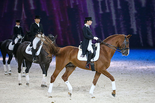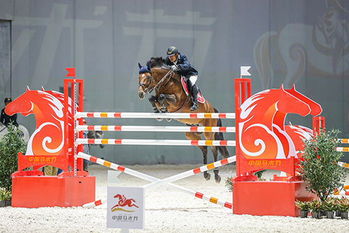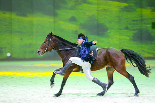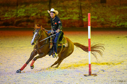 马球表演团队来自唐人马球俱乐部,8名球手手擎马球杆,骑乘马球马,英姿勃发,奋勇击球,在体育文化中心现场再现马球赛的精彩激烈与竞技张力。盛装舞步表演由奥运骑手刘丽娜领衔演出,4名骑手优雅骑乘骏马,马匹随节奏做出整齐划一的舞步动作。穿桩表演由西部马术促进会骑手呈现:4名骑手身着西部牛仔服饰,路线上设置六根障碍桩,骑手们绕桩而来,疾驰而去,在摇滚风格配乐中,西部马术粗旷的骑乘风格中可见细腻的控马技巧,特有的西部随性魅力得以展现。在开幕式的最后,是紧张刺激的“中国马城杯”超高赛,该赛事为即将打响的场地障碍赛拉开帷幕。