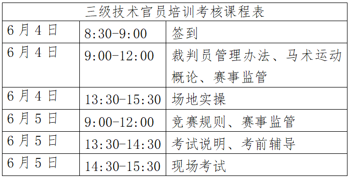 根据马术专业人才培养计划,我协会将与广东省马术协会于2024年6月4日-5日举办马术场地障碍三级技术官员培训考核活动,合格者授予中国马术协会相应等级技术官员证。现就本次培训考核相关事宜通知如下: