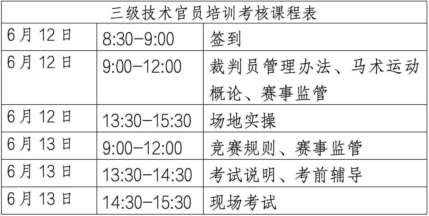根据马术专业人才培养计划,我协会将与临沂市马术运动协会于2024年6月12日-13日在丰和马术俱乐部举办马术场地障碍三级技术官员培训考核活动,合格者授予中国马术协会相应等级技术官员证。现就本次培训考核相关事宜通知如下: