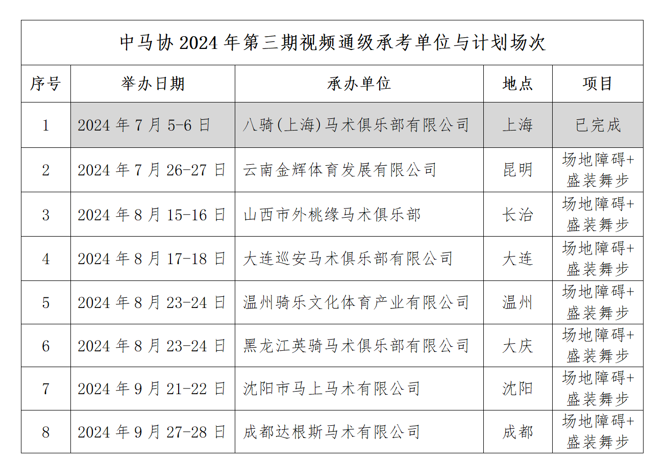 (五)在本期所有承考单位考核视频拍摄上报完成后,中国马术协会组织考官评审打分,通过考核的等级名单将在官网公示。