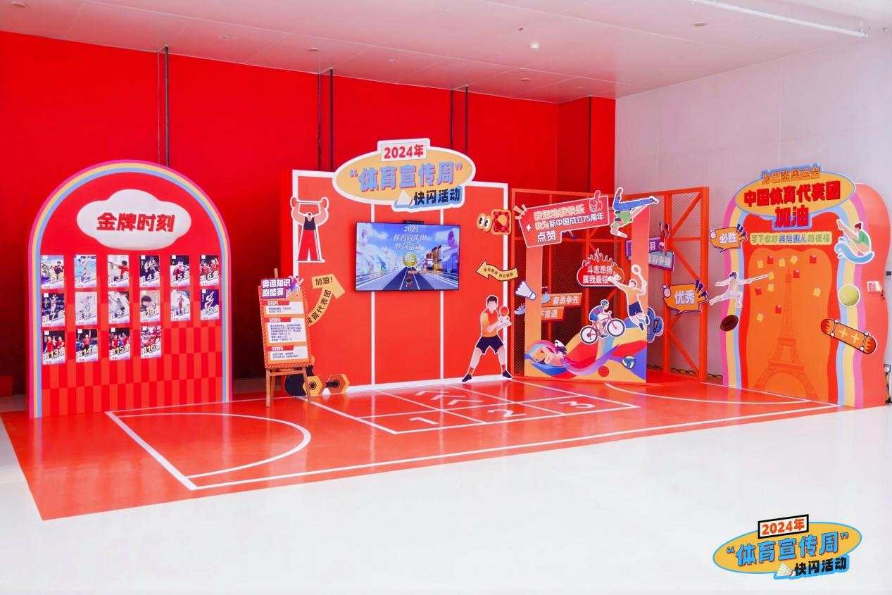 现场互动环节精彩纷呈,设置了丰富多样的内容。“打卡”区精心设计,使用插片式场景搭建和全民健身、巴黎奥运会相关设计元素,打造了适合青年群体的拍照体验区。AR/VR 体验区提供了全民健身主题的设备供民众免费体验,通过跑、跳等趣味运动形式回答体育宣传周相关问题,进行互动。“为巴黎奥运会中国体育代表团加油”区域中,现场游客可写下加油、祝福留言,积极为中国健儿加油。此外,在“水立方”的支持下,展览展示区展出珍贵北京冬奥会相关展品,与“快闪”活动融为一体,营造出浓厚的活动氛围。除此之外,现场还设立了“金牌时刻”区域,时刻展示本次巴黎奥运会中国体育代表团夺金瞬间。