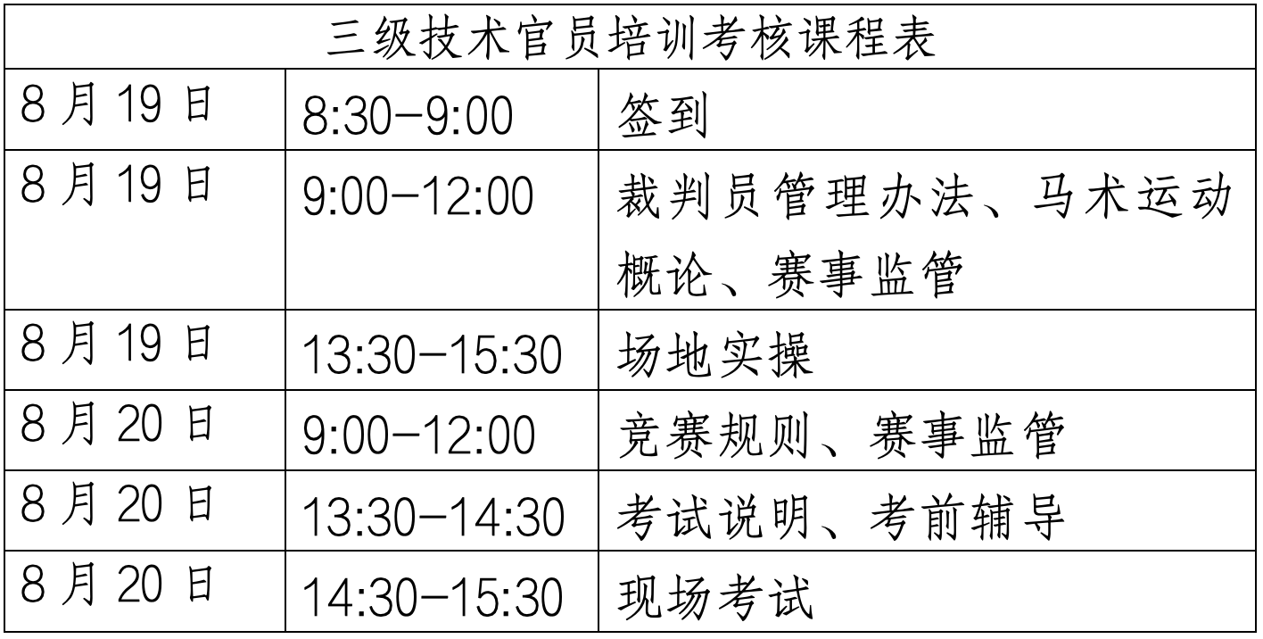 根据马术专业人才培养计划,我协会将与浙江省马术运动协会于2024年8月19日-20日在宁波骑际马术俱乐部举办马术场地障碍三级技术官员培训考核活动,合格者授予中国马术协会相应等级技术官员证。现就本次培训考核相关事宜通知如下: