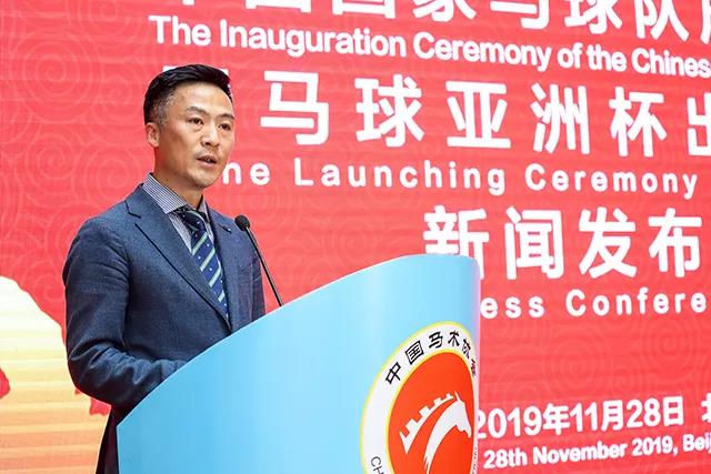 中国马术协会秘书长钟国伟作现场致辞并为中国马球国家队授旗。钟国伟提到:“近年来,马球运动在爱好者和社会机构的坚持和推动下茁壮发展。‘体育强则中国强,体育兴则国运兴。’ 在习近平新时代中国特色社会主义思想的指引下,我们迎来了复兴中国马球运动的良好机遇。自今年6月中国马术协会马球专业委员会成立大会以来,马球赛事活动日出不穷,调教、挑选马球马工作收获良多,复兴中国马球运动工作初见成效。”