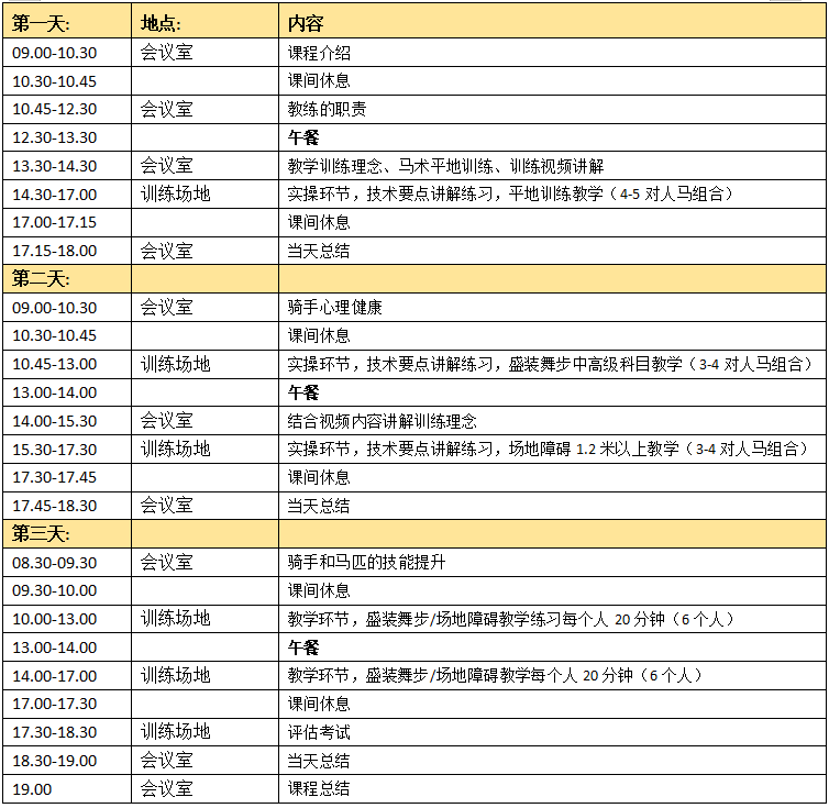 为了提升马术运动教学和训练水平,根据中国马术协会教练员培训计划,马术中高星级教练培训将与2024年12月5日-15日在无锡、东莞、武汉举办三期中高级教练培训班,进一步提升执教理论及实践水平。培训考核合格者将被授予中国马术协会星级教练员能力水平证书。