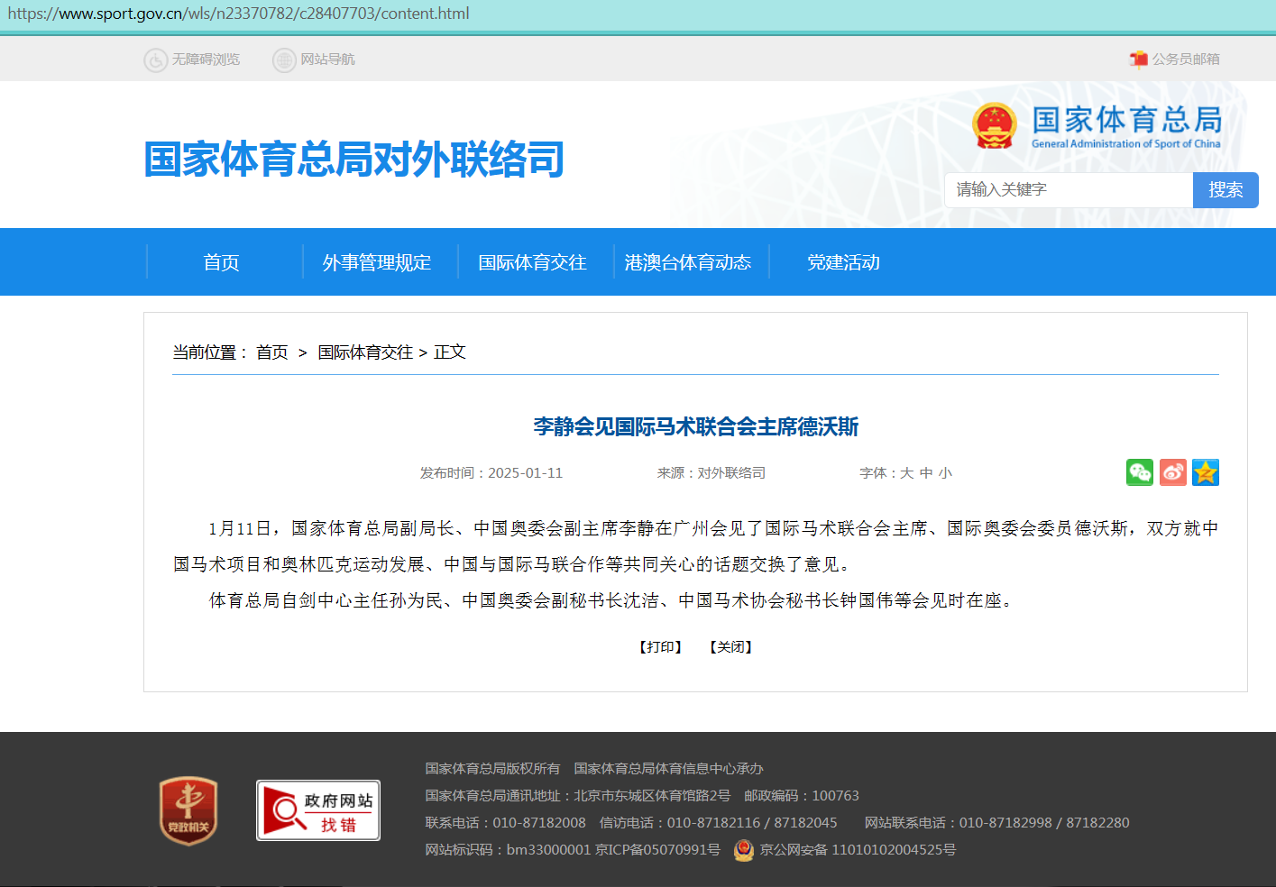 国家体育总局领导会见国际马术联合会主席德沃斯