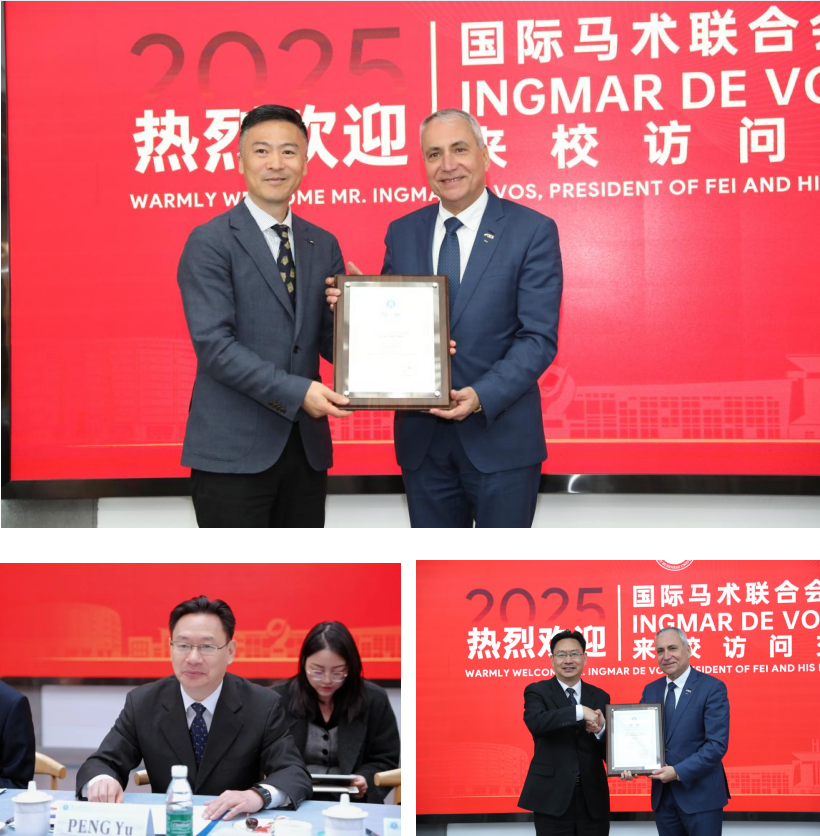 2025年1月16日,中国马术协会秘书长钟国伟、副秘书长兼商务部部长陈九庆,陪同国际马术联合会主席德沃斯一行到访国家马术学院,与武汉商学院共同探讨国家马术学院建设及中国马术运动产业发展、国际马术人才培养、马科学研究及马术运动普及推广等议题,并就合作培养专业人才达成初步意向。