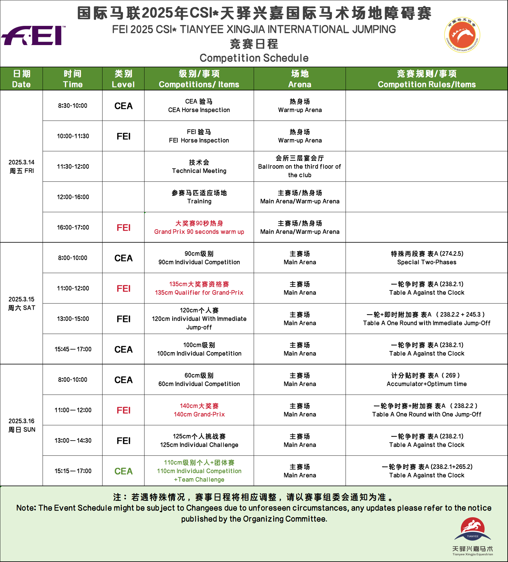 国际马联2025年CSI*天驿兴嘉国际马术场地障碍赛将于2025年3月14日(周五)至3月16日(周日)在浙江省宁波市天驿兴嘉马术俱乐部举办。为使比赛顺利进行,现将赛事有关事宜通知如下: