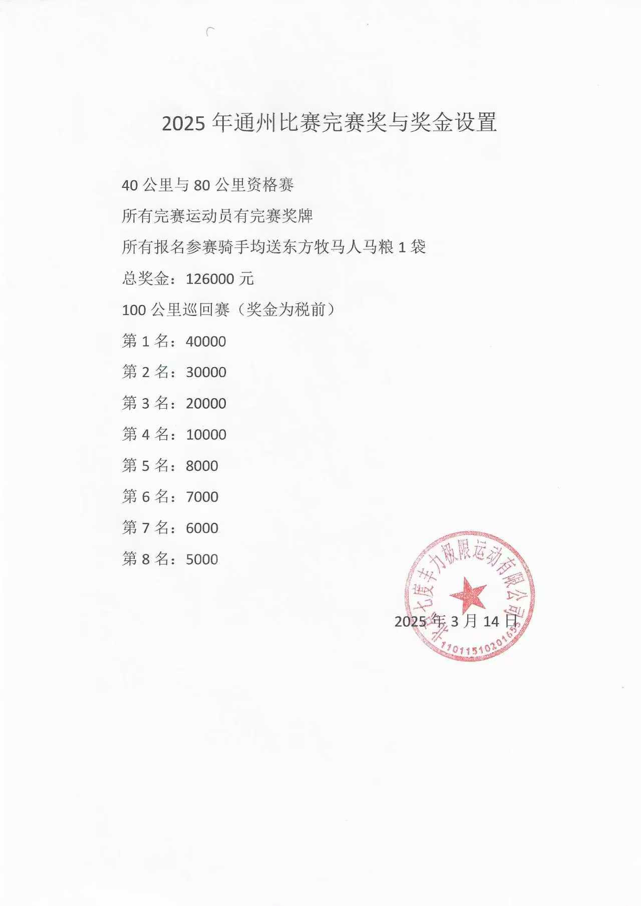 2025年中国马术耐力巡回赛(北京站)暨40公里80公里达标赛(北京站)将于2025年4月25日-4月27日在北京市通州区漷县镇举行。请各位耐力赛骑手提前熟悉规则,结合日程安排,提前做好人马训练等准备工作。