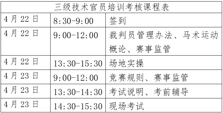 根据马术专业人才培养计划,我协会将与广东省马术协会于2025年4月22日-23日在深圳市马术协会举办马术场地障碍项目三级技术官员培训考核活动,合格者授予中国马术协会相应等级技术官员证。现就本次培训考核相关事宜通知如下:
