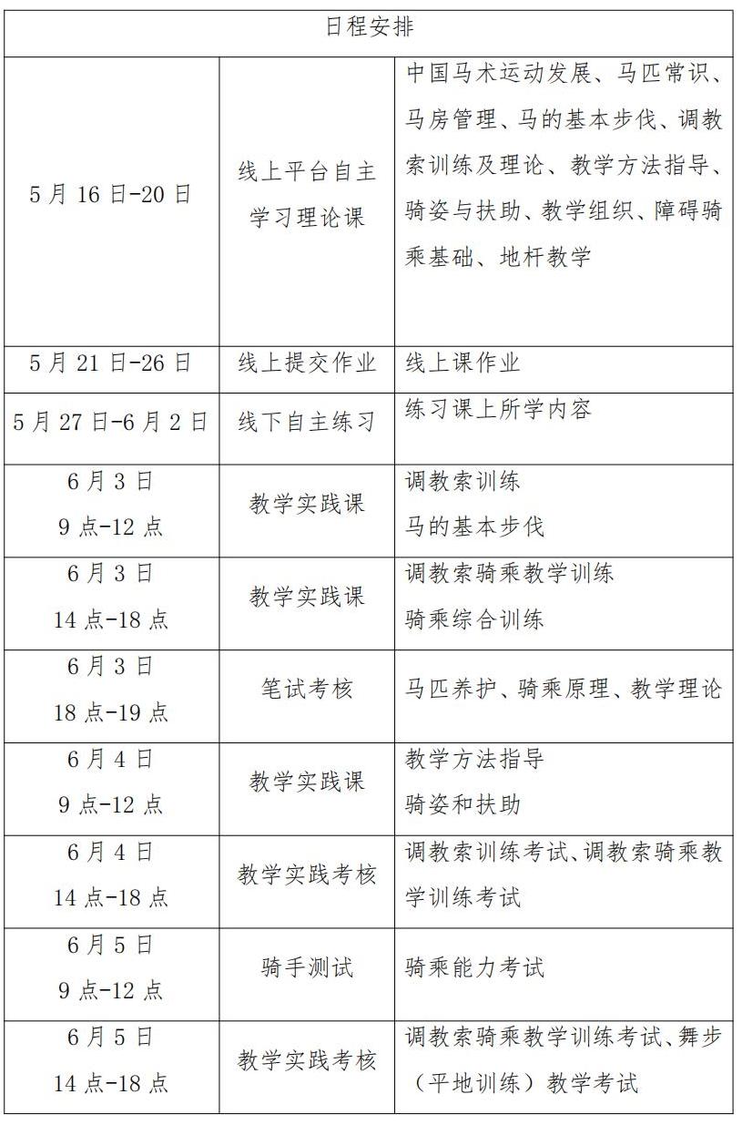 (三)线下辅导和实践考核:2025年6月3日-5日,在武汉骑典梧桐雨马术天地店进行线下集中辅导与实践考核。