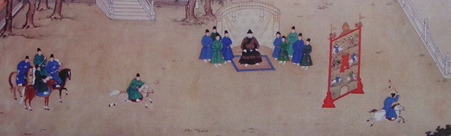 辽代陈及之所绘的《便桥会盟图》卷,表现的是唐太宗李世民与突厥颉利可汗在长安城西渭水便桥会盟的场景。画卷中刻画了两队不同冠服的毬手激烈竞争的场面。图中可看到右侧有十余名骑兵持偃月毬杖向前奔驰,左侧有四个骑士正在激烈地争抢击毬。此画可以旁证唐代初期在西安已经有马球运动。