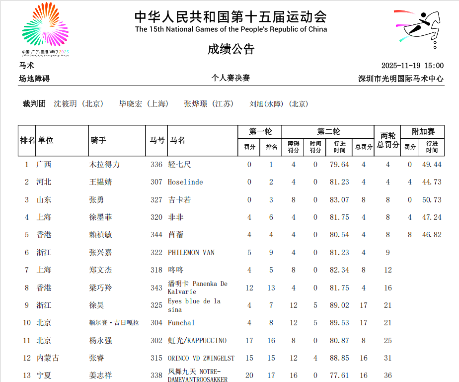 第十五届全国运动会马术项目收官之战——场地障碍个人赛决赛于11月19日在深圳市光明国际马术中心激情上演。22对人马组合在1.50米至1.60米高的障碍间展开了一场速度、高度与心理的极限较量。