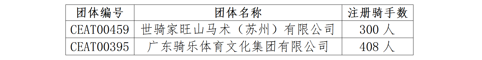 根据《中国马术协会骑手注册管理办法》第十四条规定“团体单位(非省级协会单位)旗下年度注册骑手数量达到 300 人,则该团体会员单位获得下一年度团体会员会费全额减免优惠。”现对符合规定的团体单位进行本年度会费减免: