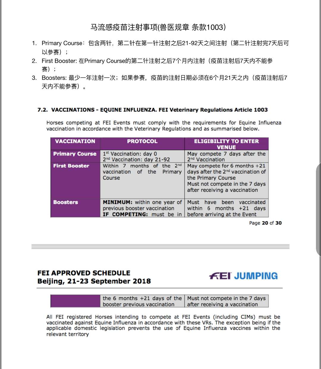 各参赛运动队于2021年5月13日报到,报道的同时提交马匹护照和马匹检疫证明,未提交相关证明的马匹不得进入马厩。参赛马匹均须按国际马联相关规定注射流感疫苗,并在护照进行详细记录,无疫苗或疫苗不符合国际马联要求的马匹,组委会有权拒绝其参赛。