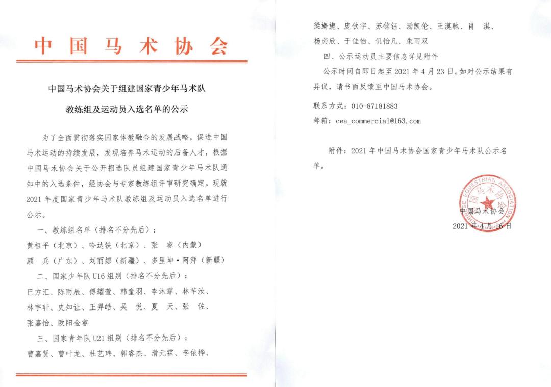 为了全面贯彻落实国家体教融合的发展战略,促进中国马术运动的持续发展,发现培养马术运动的后备人才,根据中国马术协会关于公开招选队员组建国家青少年马术队通知中的入选条件,经协会与专家教练组评审研究确定。现就2021年度国家青少年马术队教练组及运动员入选名单进行公示。