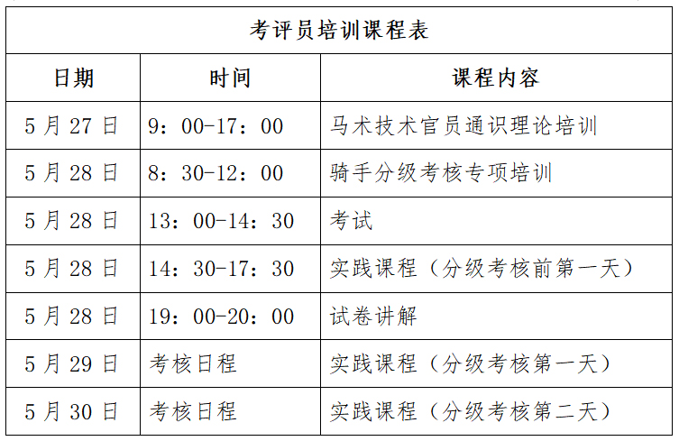 根据考评员培训计划,我协会将于2021年5月27日-30日在福建省福州市川捷国际马术俱乐部举办考评员培训活动,合格者授予相应等级考评员证书。现就本次培训考核相关事宜通知如下: